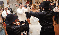 THE MITZVAH DANCE Entertaining the bride and groom on their wedding day is not only a mitzvah (a good deed), but also an obligation. At traditional Jewish weddings, the couple is seated on chairs and guests dance before them with masks, silly costumes, and props.